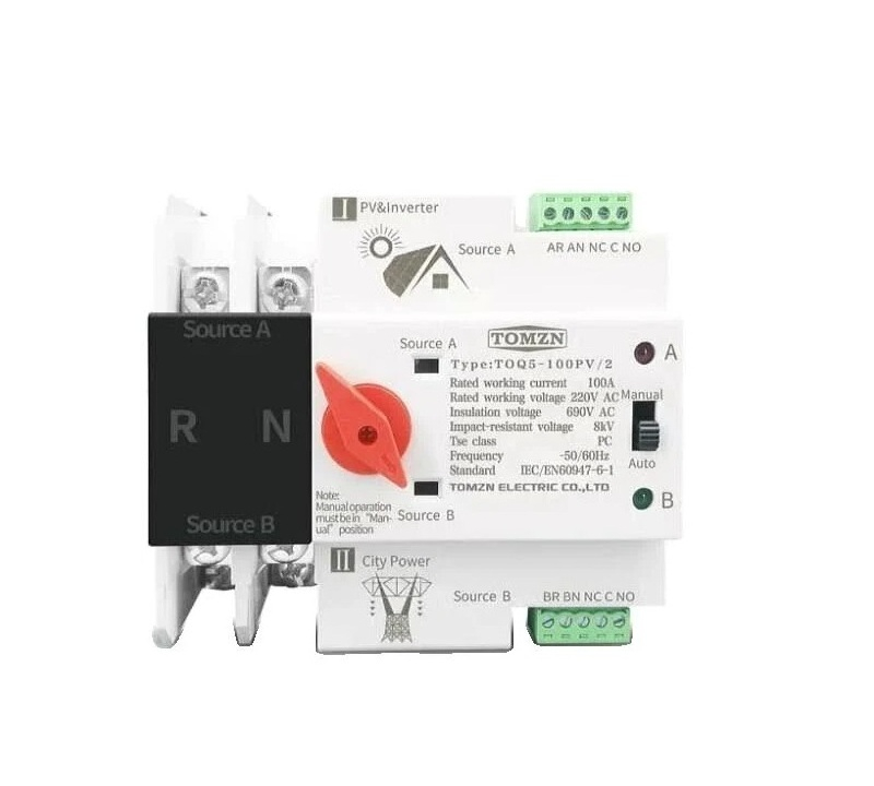 Comutatorul automat de transfer ATS 2P 100A este proiectat special pentru sisteme fotovoltaice cu invertor, unde energia solară reprezintă sursa principală de alimentare. Dispozitivul gestionează automat comutarea între două surse de energie, asigurând continuitatea alimentării fără întreruperi perceptibile.